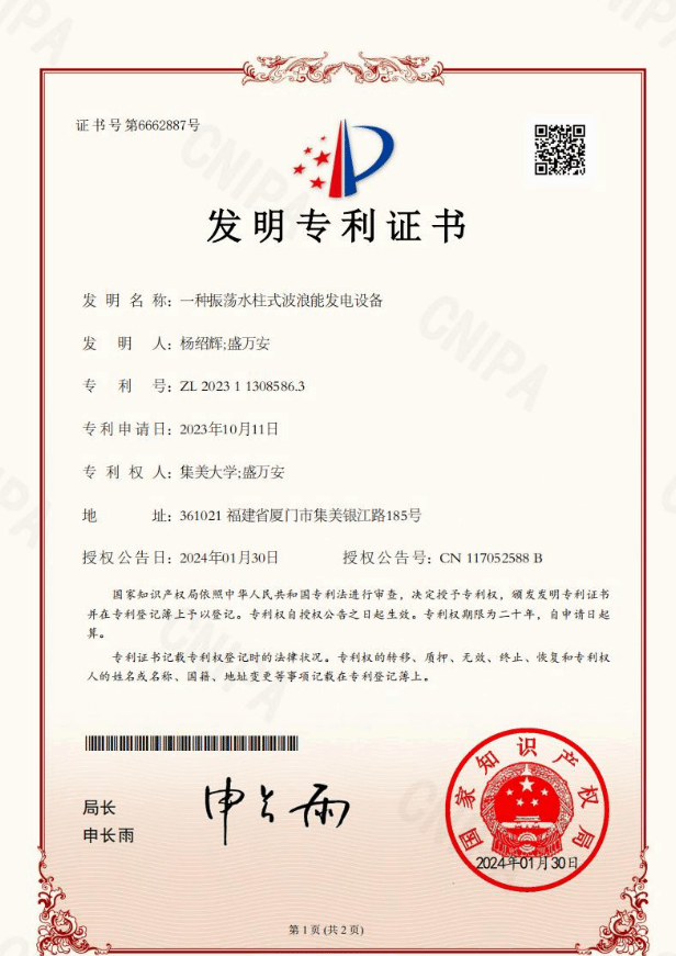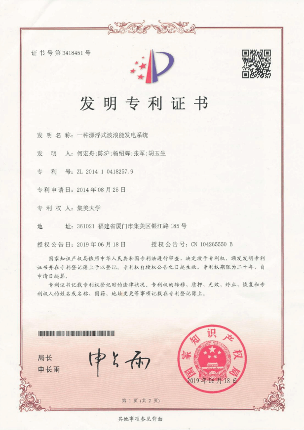 依托国家重点研发计划、国家自然科学基金等项目开展自主研发,平台已入级中国船级社,是国内首套通过该机构审核认证的可自航气动式波浪能发电平台,并已取得适航证书,技术水平处于国内领先。