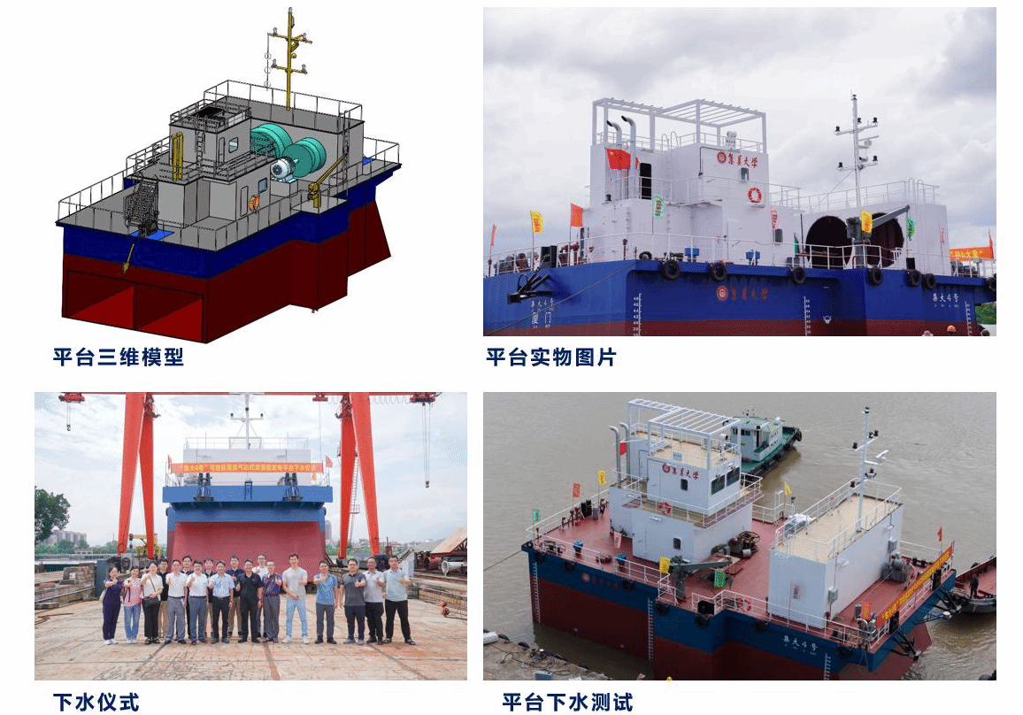 “集大 4 号”可自航混流气动式波浪能发电平台是一种基于振荡水柱式发电原理、采用新型混流空气透平技术的全天候波浪能发电平台。平台总长 21.60 米、最大船宽 13.25 米、型宽 9.85 米、型深 6.00 米、吃水 4.1 米、设计发电量为 100千瓦、最大航速为 5 节。平台包含后弯管 OWC 波浪能俘获装置、新型混流式 PTO及波电转换装置、航行与发电控制系统、漂浮主体以及辅助设备等核心系统。