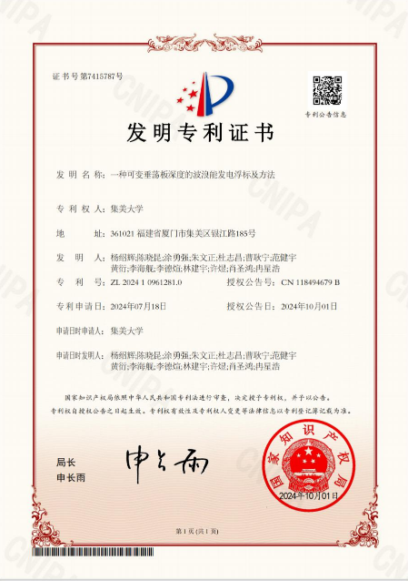 经水槽模拟海况实验,验证了浮标的性能稳定性,并与中海油公司合作,先后在天津中心渔港、漳州港等多地投放了 12 个波浪能浮标样本,不间断运行 6 个月,得到了预期的效果。样机正在厦门海域试运行,并有配套厂家可提供产品量产。