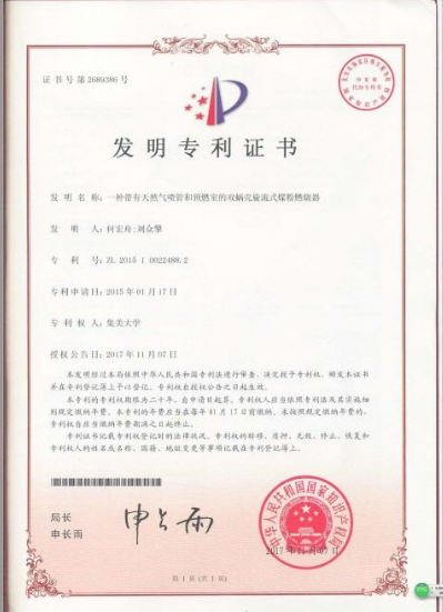 开发了“一种带有天然气喷管和预燃室的双蜗壳旋流式煤粉燃烧器”、“一种带有天然气喷管和预燃室的双蜗壳旋流式煤粉燃烧器”。针对 10-20t/h 级小锅炉,锅炉飞灰含碳量控制在 10%以下,锅炉燃烧效率达 90%以上,氮氧化物排放控制在10ppm 以下;污染物排放水平与燃烧同吨位天然气锅炉相当。