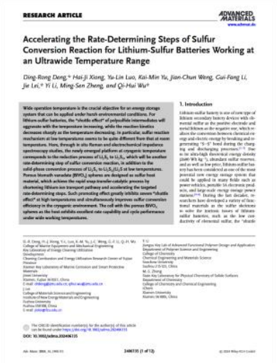 首次通过原位拉曼光谱、原位交流阻抗及密度泛函计算分析出锂硫电池低温下的反应过程以及宽温域下反应决速步骤,并设计出一种针对这些反应决速步骤有特异性优化的钒酸铋多孔微球材料作为电池的硫骨架材料,能将锂硫电池的有效工作温度范围拓宽到-40℃到70℃的超宽范围。