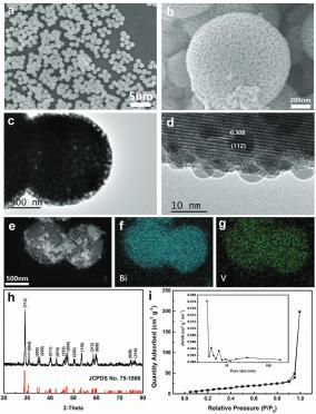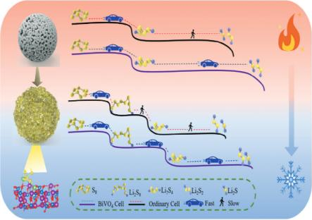 合成钙钛矿半导体多孔钒酸铋球(BiVO4),并将其用作锂硫电池的宿主材料,通过缩短锂离子传输路径、加速目标速率决定步骤来实现快速转移催化过程,而且,材料特殊的多孔结构也可以帮助快速完成硫化物的吸附—转移—催化,抑制了高温下的“穿梭效应”所导致的反应动力学急剧下降的现象,同时提高了低温环境下的硫转化效率。